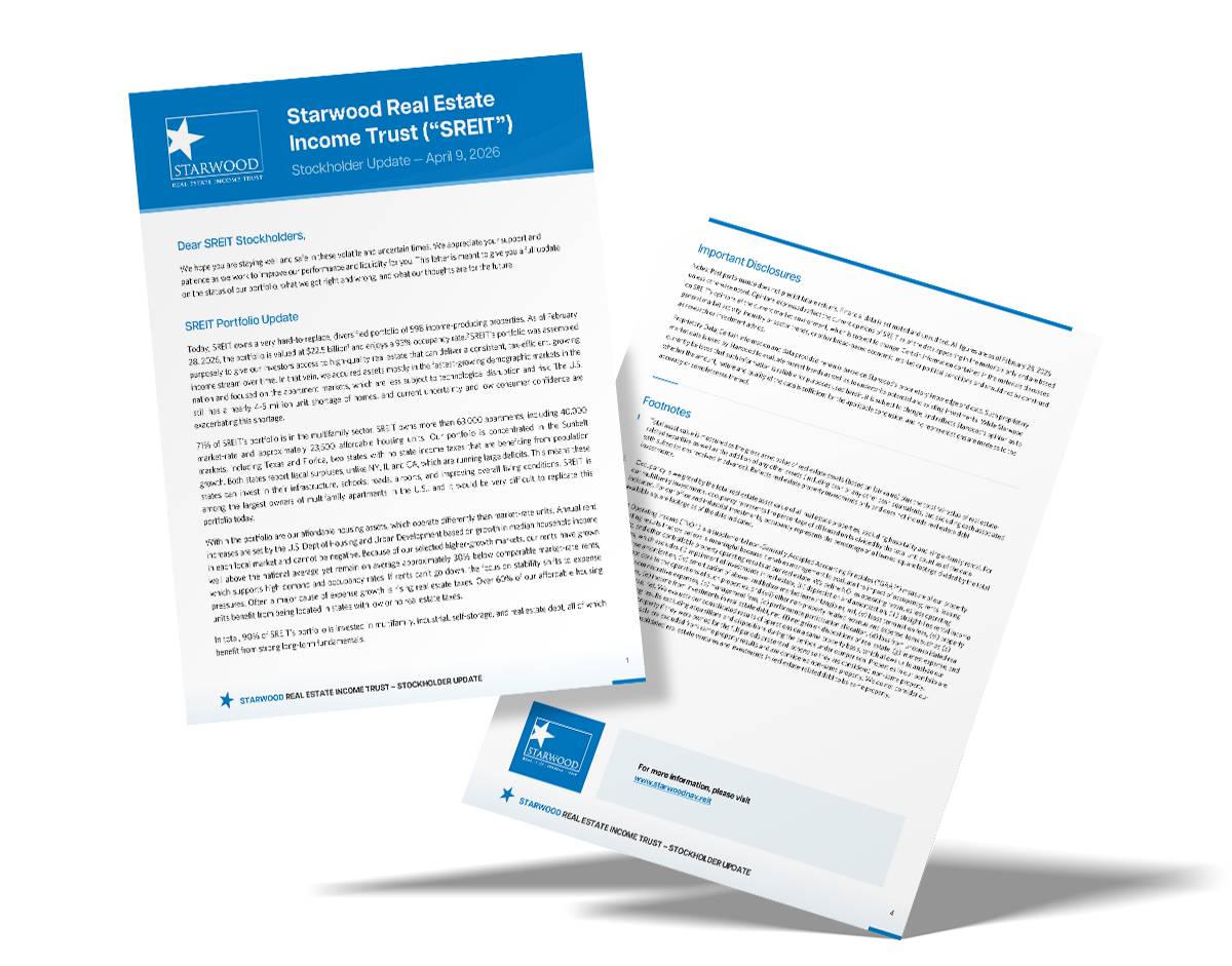 Starwood Capital Group, one of the world’s leading real estate investment managers, launched SREIT in 2018 to provide a differentiated and accessible portfolio of real estate to a broader group of investors. As a long-term asset class, real estate demands conviction and expertise—both of which are embedded in SREIT’s portfolio and strategy. With a strong foundation and a forward-looking approach, we believe there are many opportunities ahead to drive income and growth for our investors.